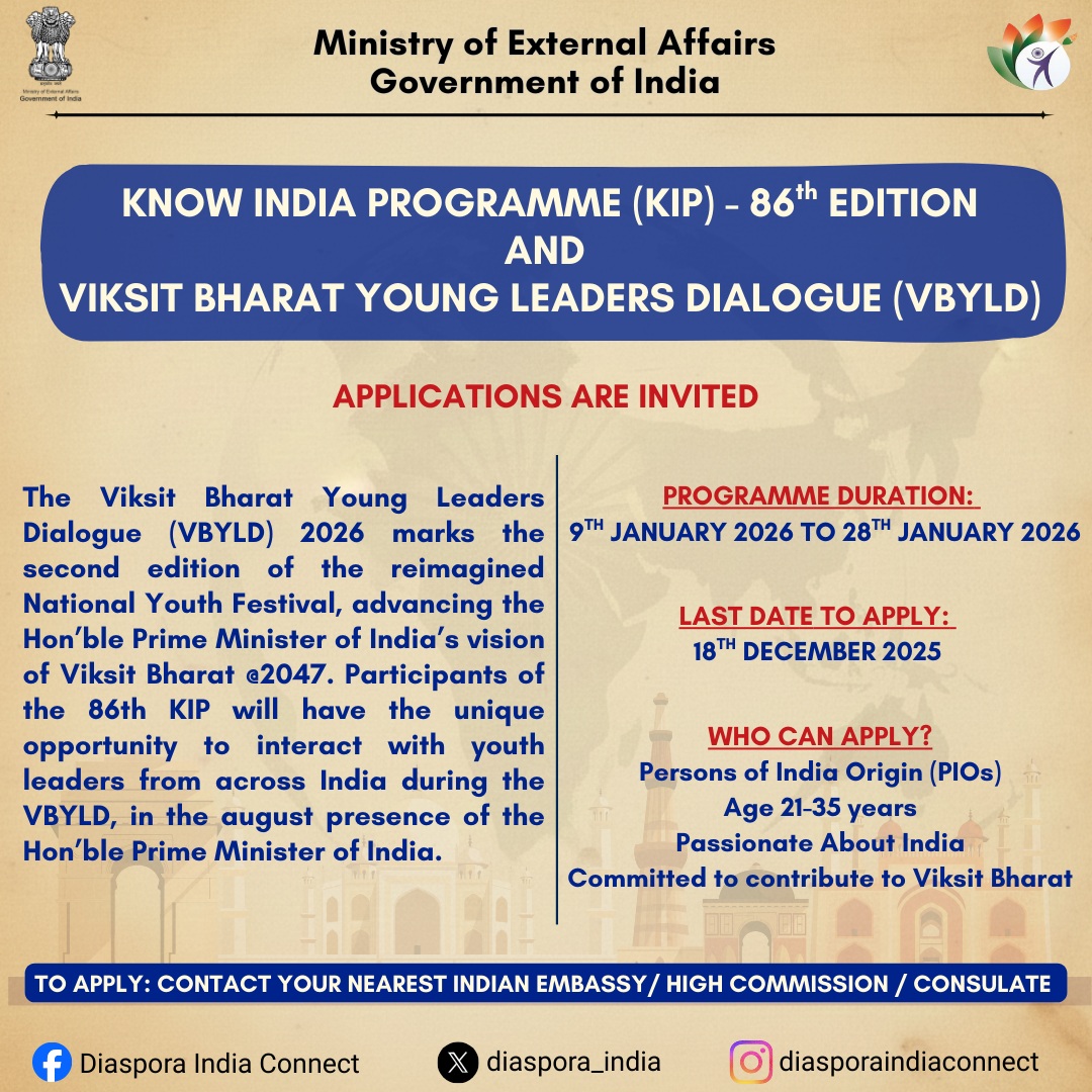 The Ministry of External Affairs, Government of India, is pleased to announce the 86th edition of the Know India Programme (KIP), scheduled to be held from 09 January to 28 January 2026, alongside the Viksit Bharat Young Leaders Dialogue (VBYLD) 2026.